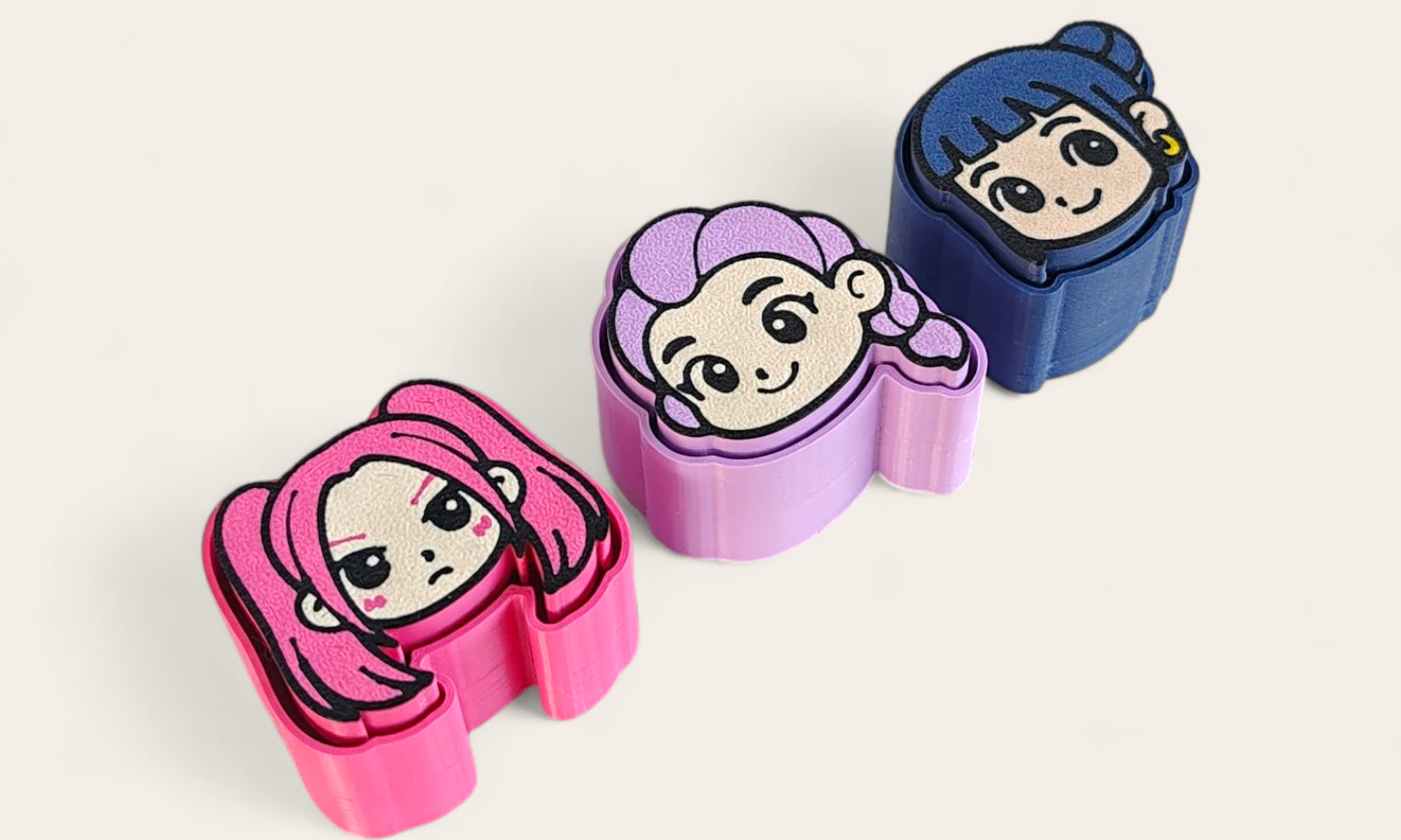 Cada uno está impreso en 3D con todo detalle y color, perfectos para acompañarte en tu escritorio, estantería o para coleccionar a tus caza-demonios favoritas.